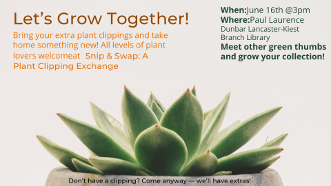 Bring your extra plant clippings and take home something new! All levels of plant lovers welcome at Snip & Swap: A Plant Clipping Exchange. Don’t have a clipping? Come anyway — we’ll have extras!